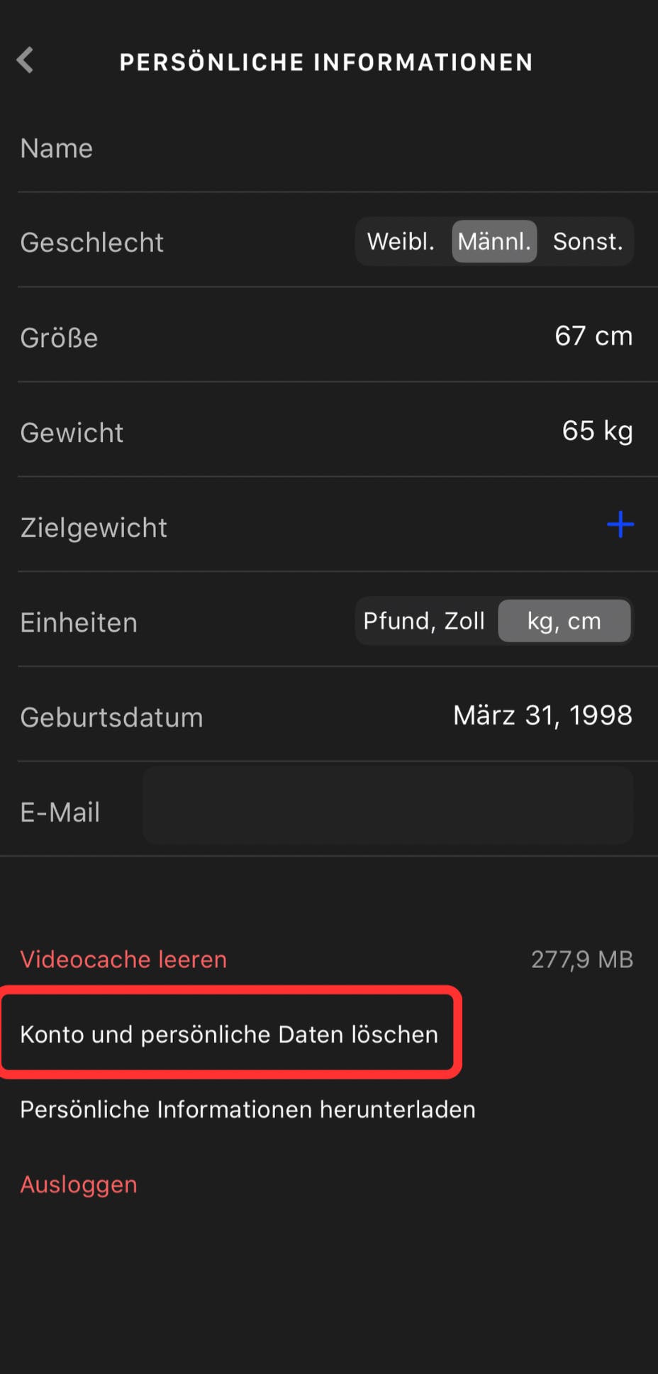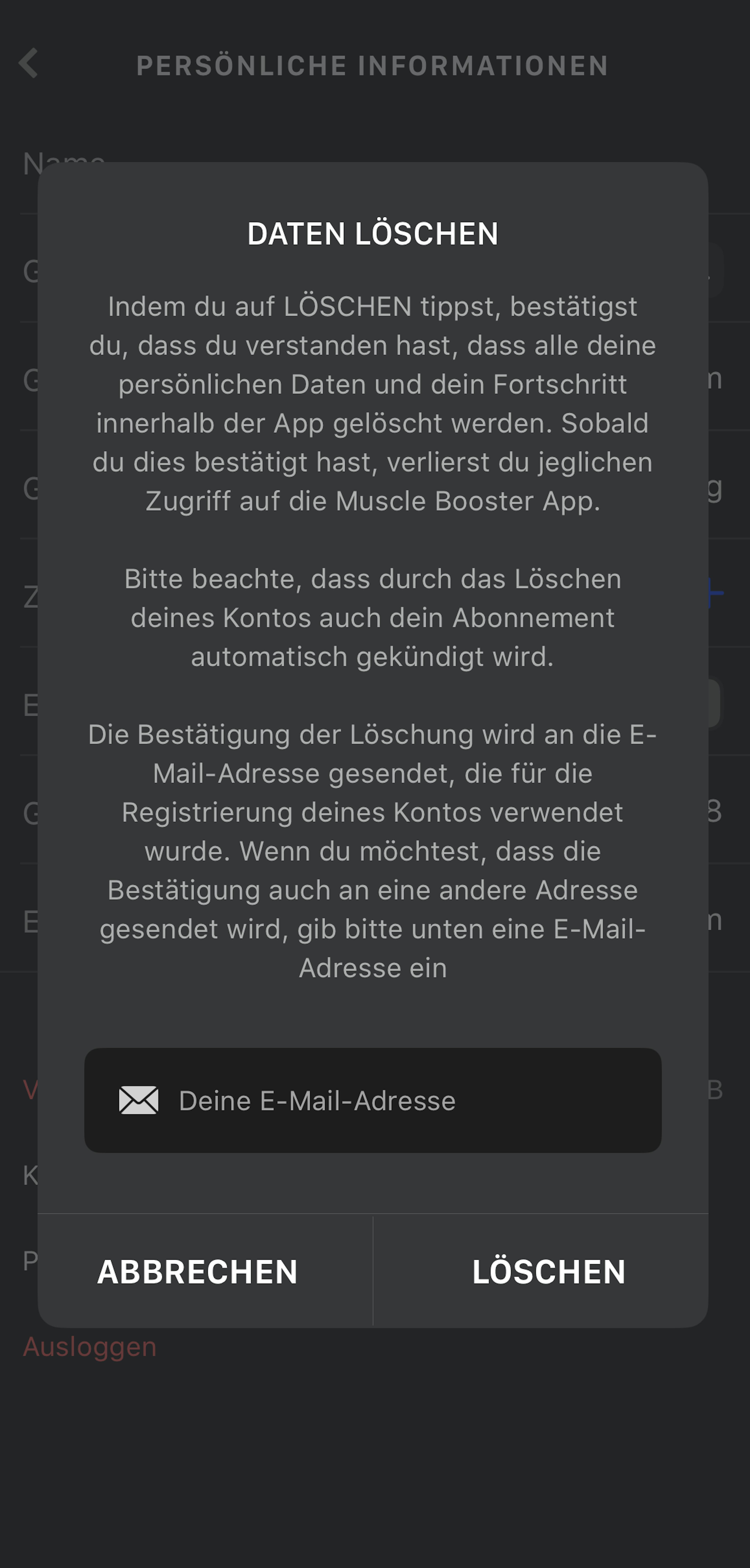 ❗Bitte beachten Sie, dass das Löschen Ihres persönlichen Kontos in der App zur sofortigen Kündigung Ihres Abonnements führt und all Ihre Fortschritte verloren gehen.