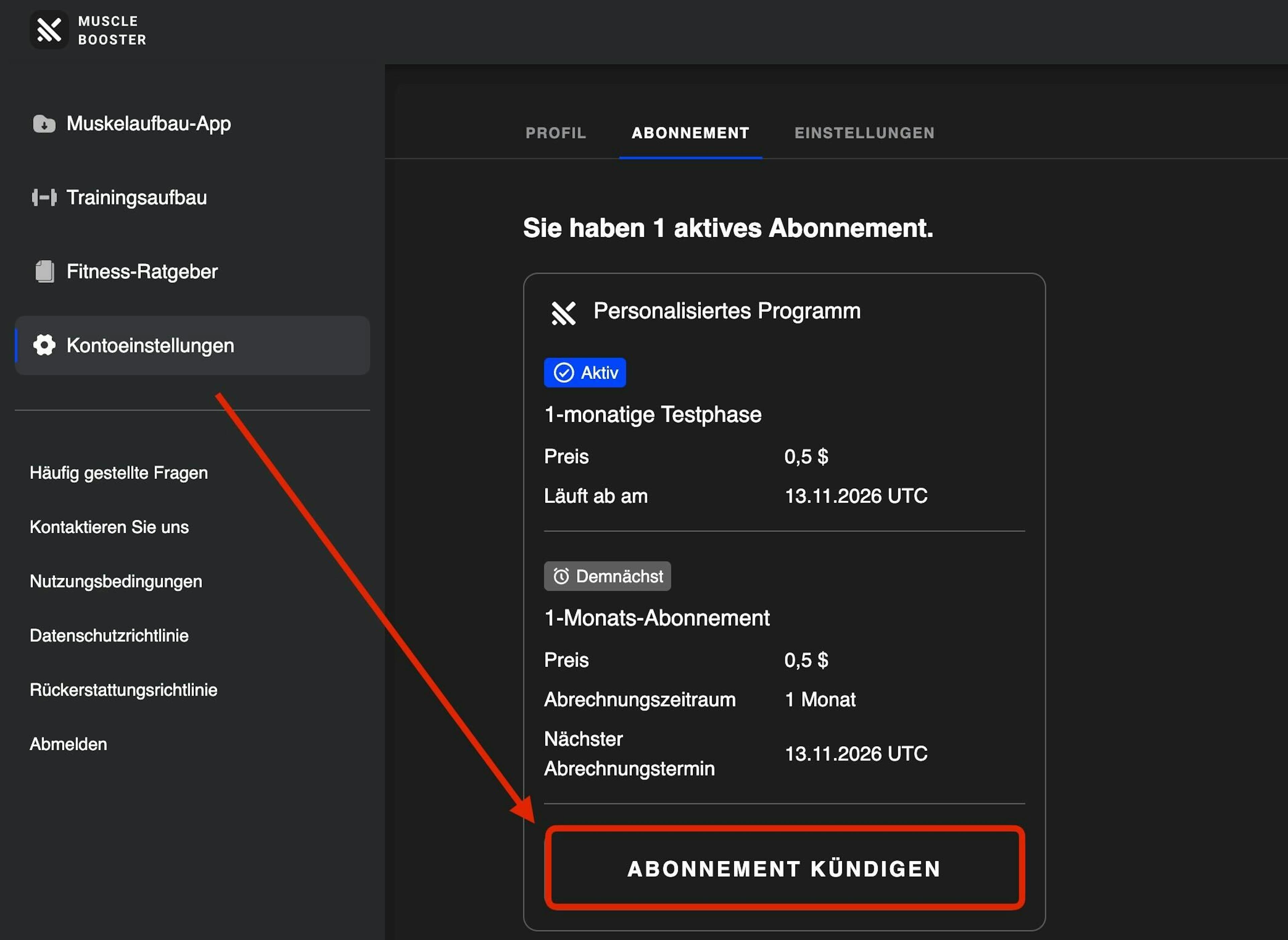Bitte stellen Sie sicher, dass Sie mindestens 24 Stunden vor Ihrem nächsten Abrechnungsdatum kündigen, um eine Abbuchung für den nächsten Zyklus zu vermeiden.