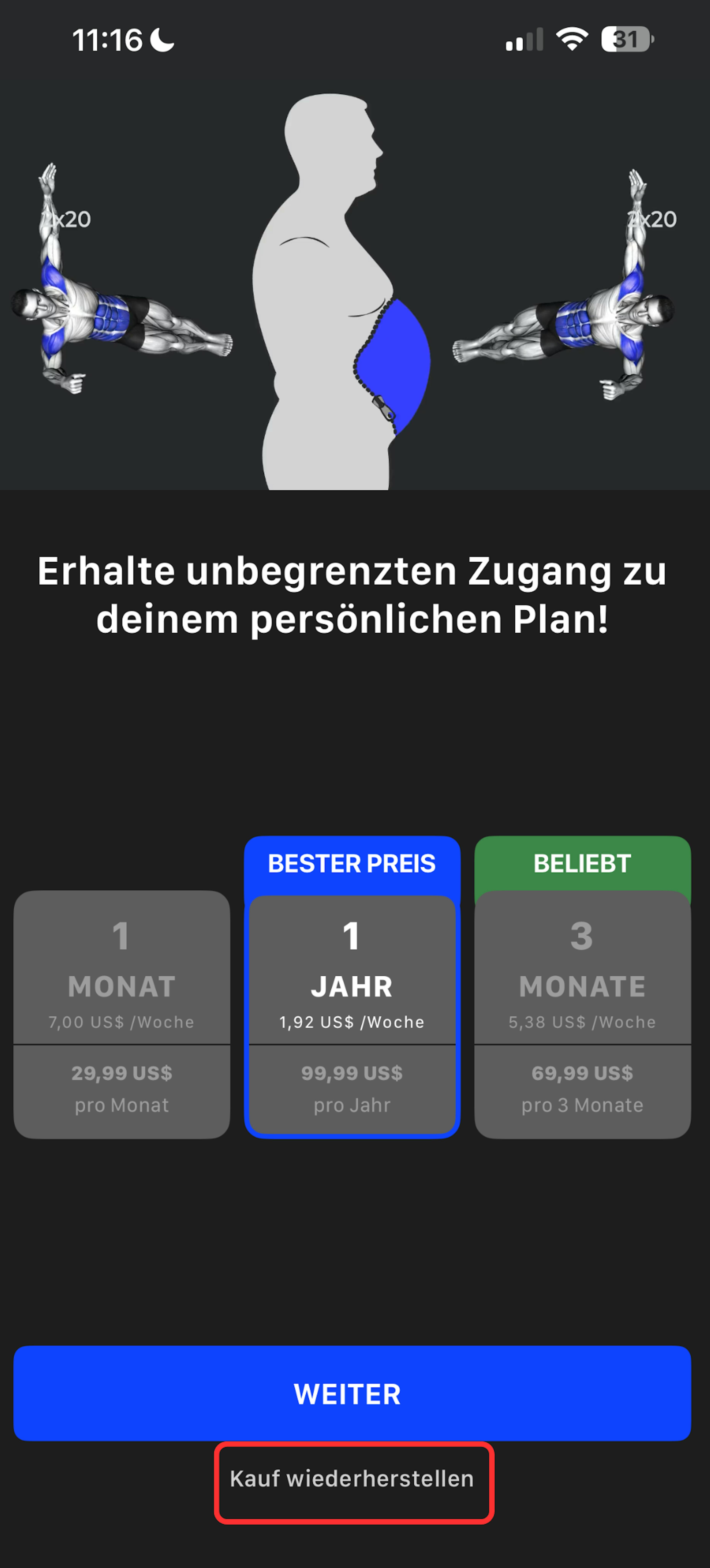3. Geben Sie Ihre Informationen ein. Wenn Sie zum Zahlungsbildschirm gelangen (dem, auf dem Sie verschiedene Abonnementoptionen sehen können), tippen Sie unten auf dem Bildschirm auf die Schaltfläche Kauf wiederherstellen (wie unten gezeigt).