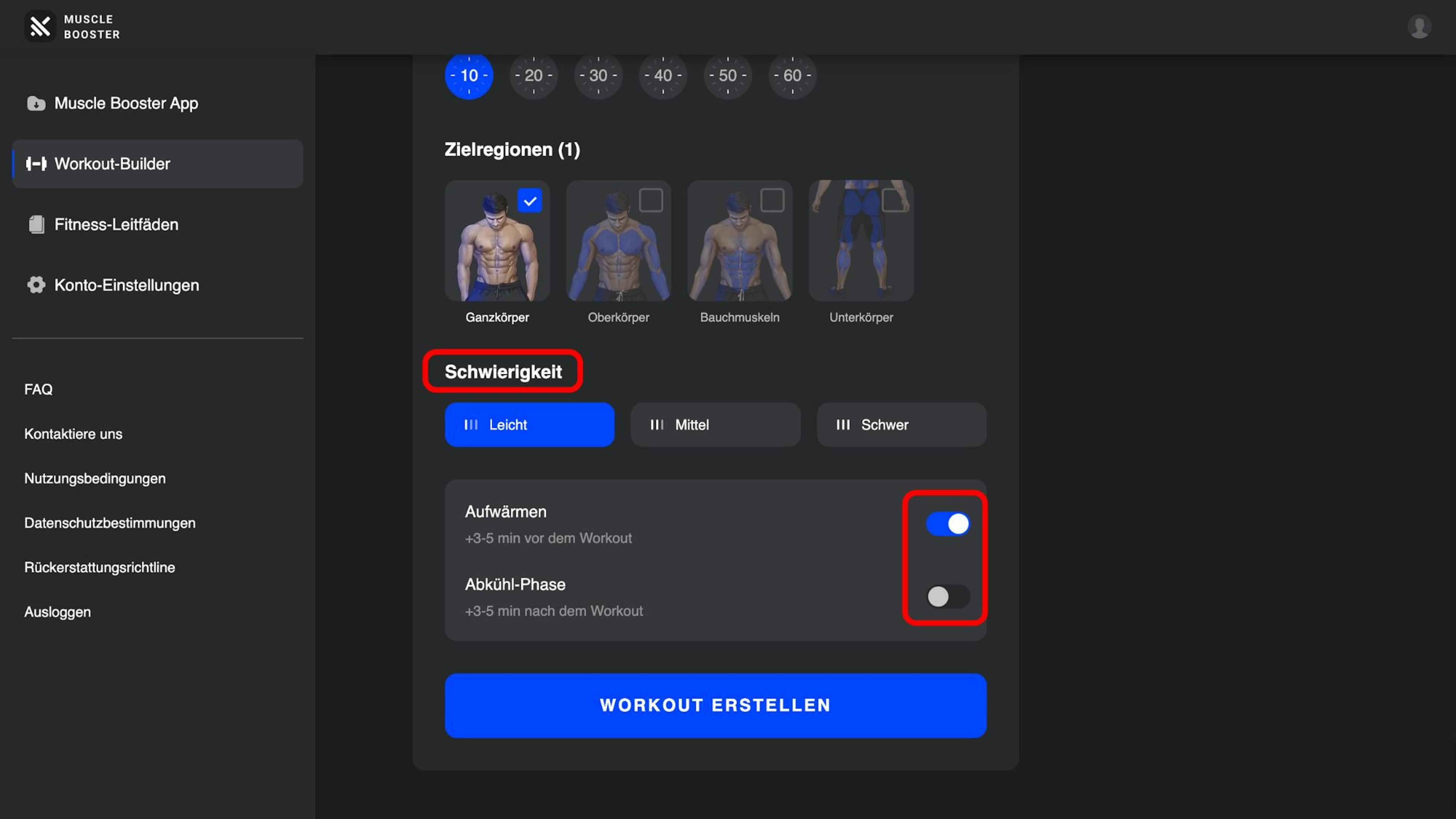 Im nächsten Schritt wählst du die Trainingsdauer aus und bestimmst die Zielbereiche, die du trainieren möchtest.