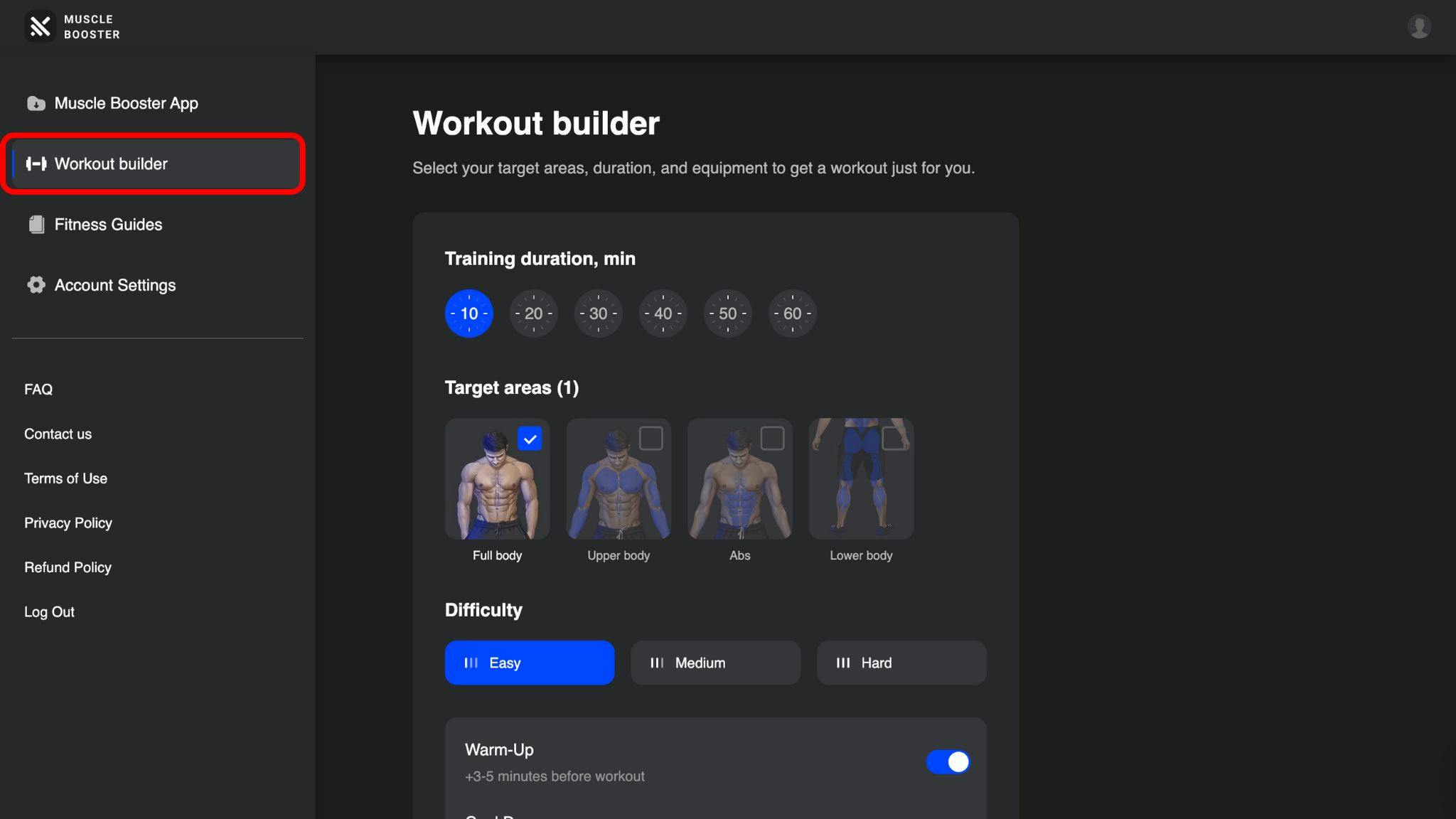 The app will default to Full body as the preferred target area, however, if you don’t have enough time for a full workout or just want to focus on individual muscle groups, you can customize this selection as desired.