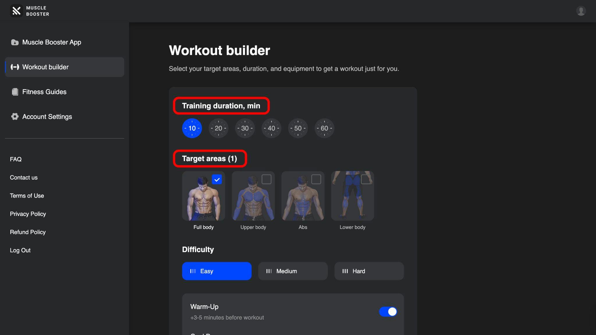 The next step is to select a training duration and choose the target areas you’d like to train.