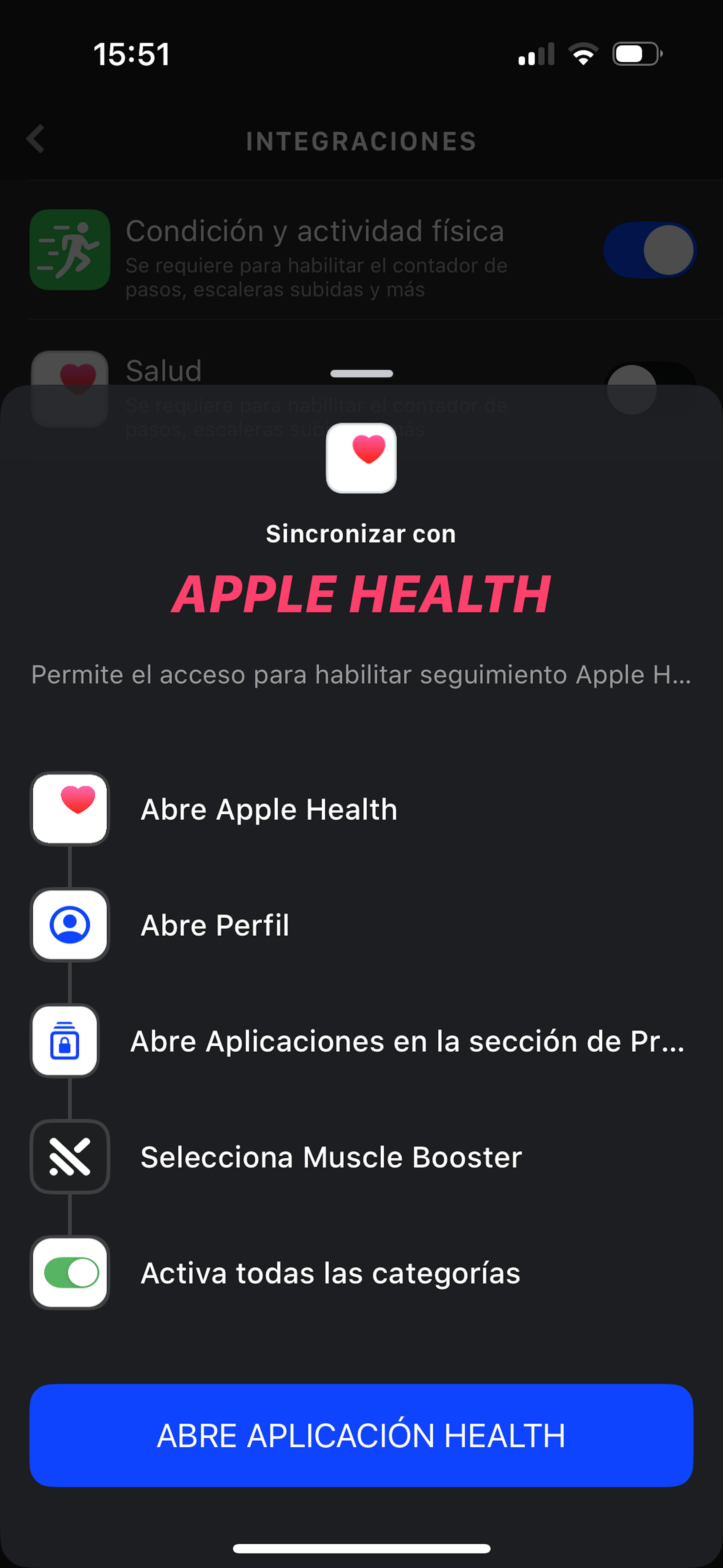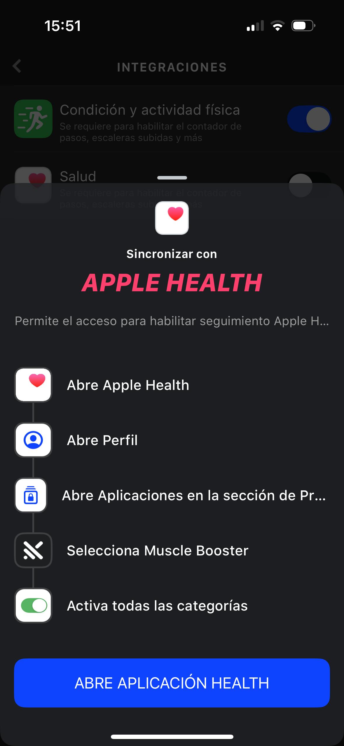 Puedes integrar la aplicación Muscle Booster con Apple Health siguiendo estas instrucciones: