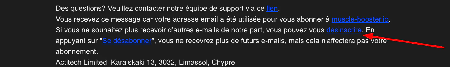 Si vous ne souhaitez plus recevoir d’e-mails de notre part, vous pouvez vous désabonner en bas de nos e-mails via le lien Se désabonner, comme illustré ci-dessous.
