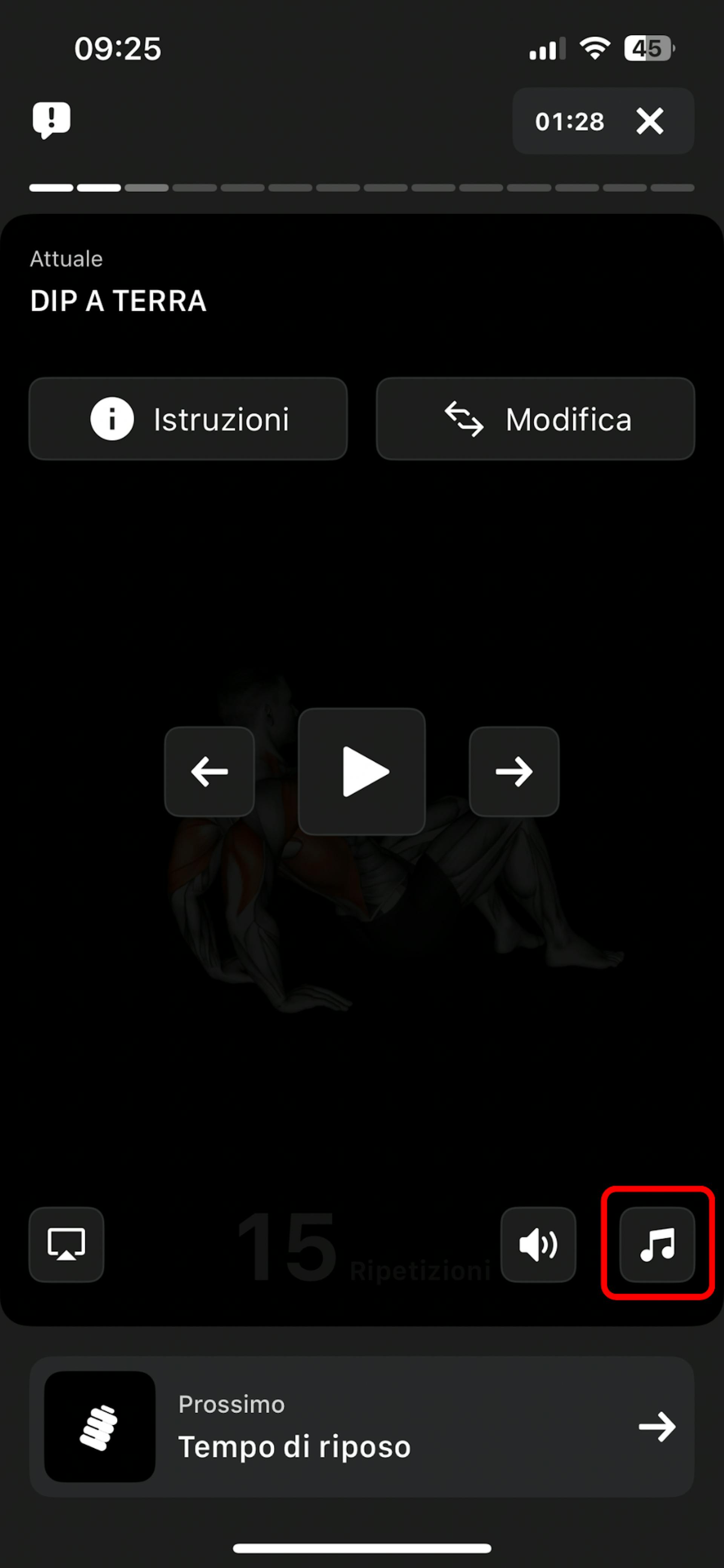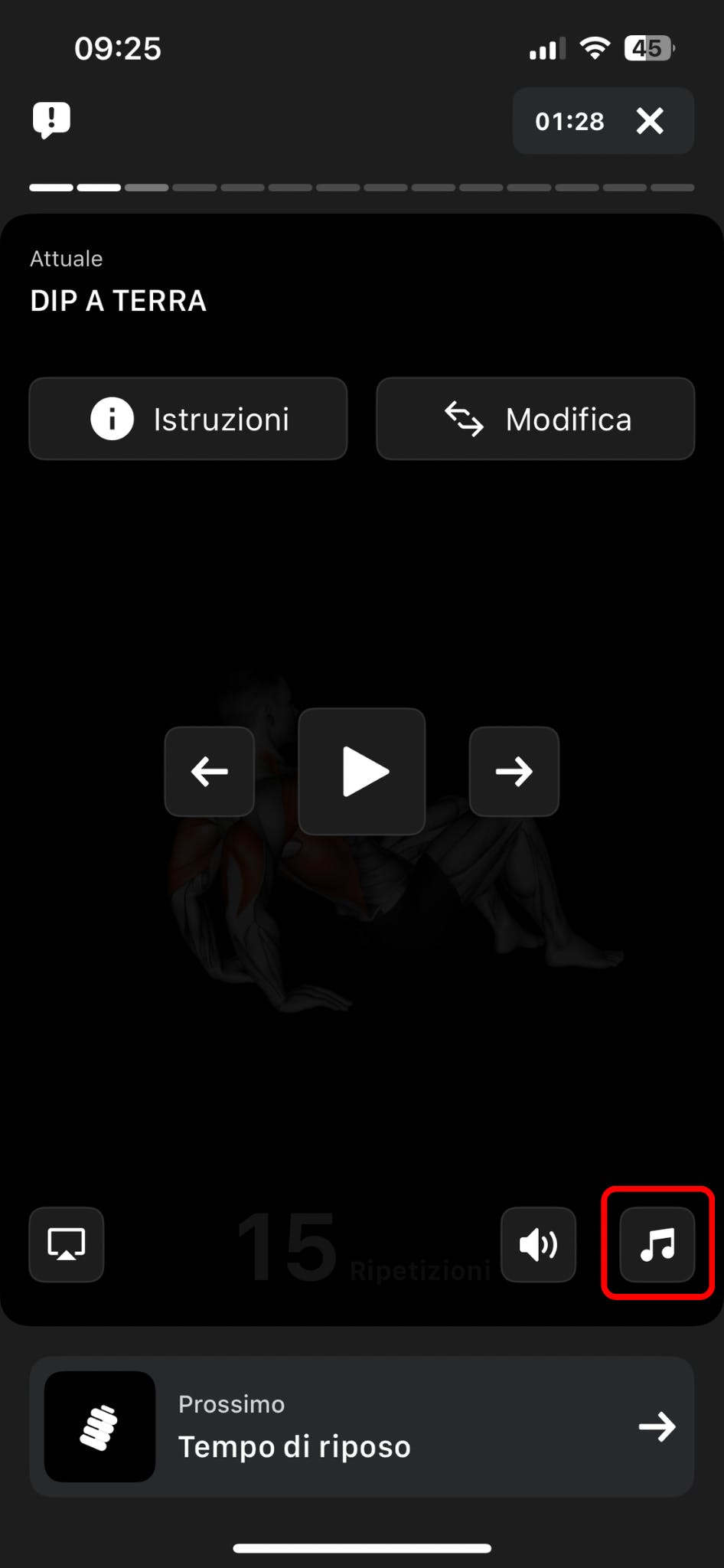 Metti in pausa l'allenamento e tocca l'icona Musica come mostrato di seguito.