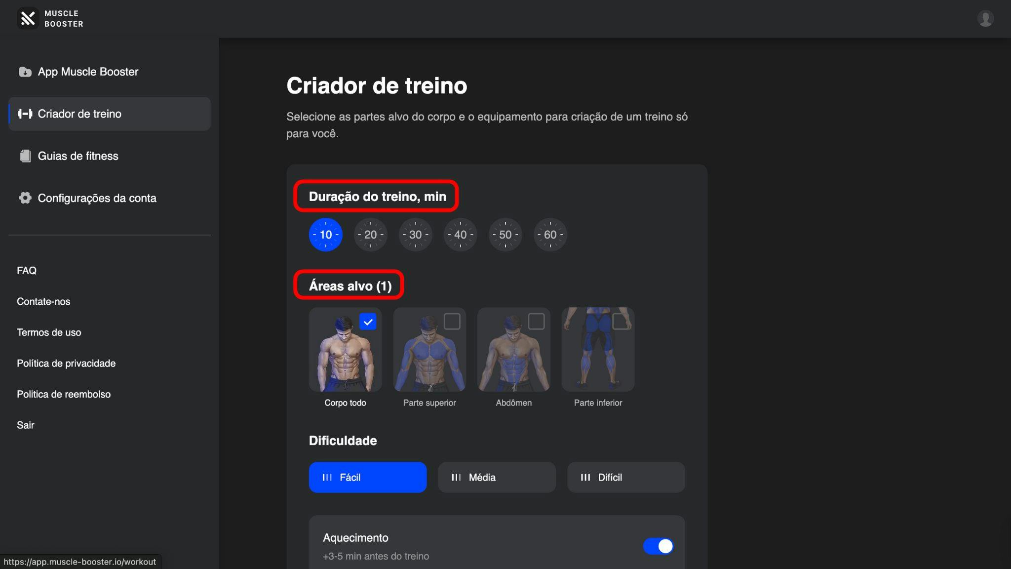 O passo seguinte é selecionar uma duração para o treino e escolher as áreas do corpo que gostaria de trabalhar.